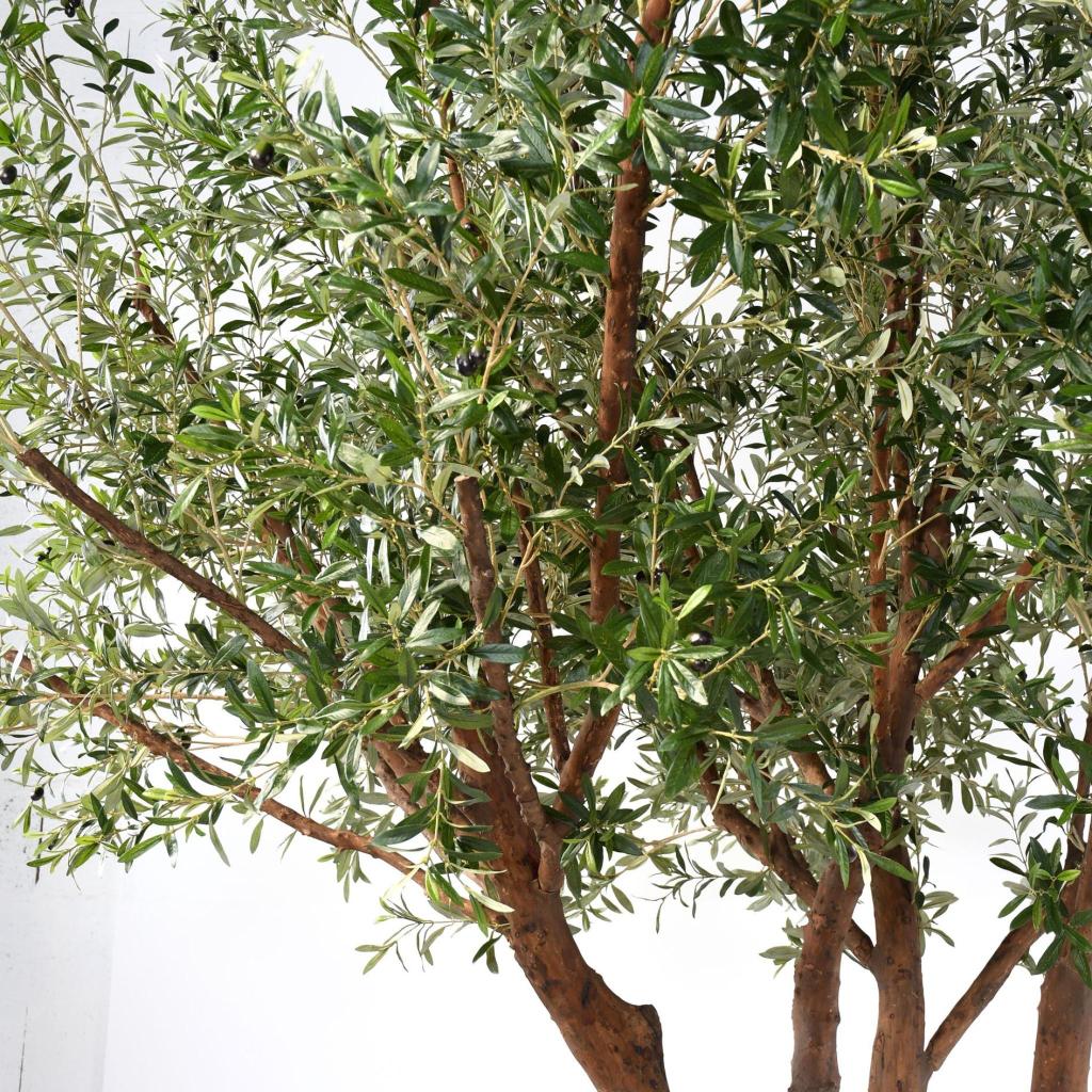 Chaque branche en bois et chaque feuille en tergal ont été minutieusement conçues pour reproduire fidèlement le détail et la texture de l'olivier naturel. Les branches de 6 à 8 cm de diamètre émanent du tronc principal en fibre de verre pour se déployer gracieusement vers l'extérieur. La hauteur sous feuillage de 180 cm procure assez de liberté pour y installer aisément une table ou un coin lecture.